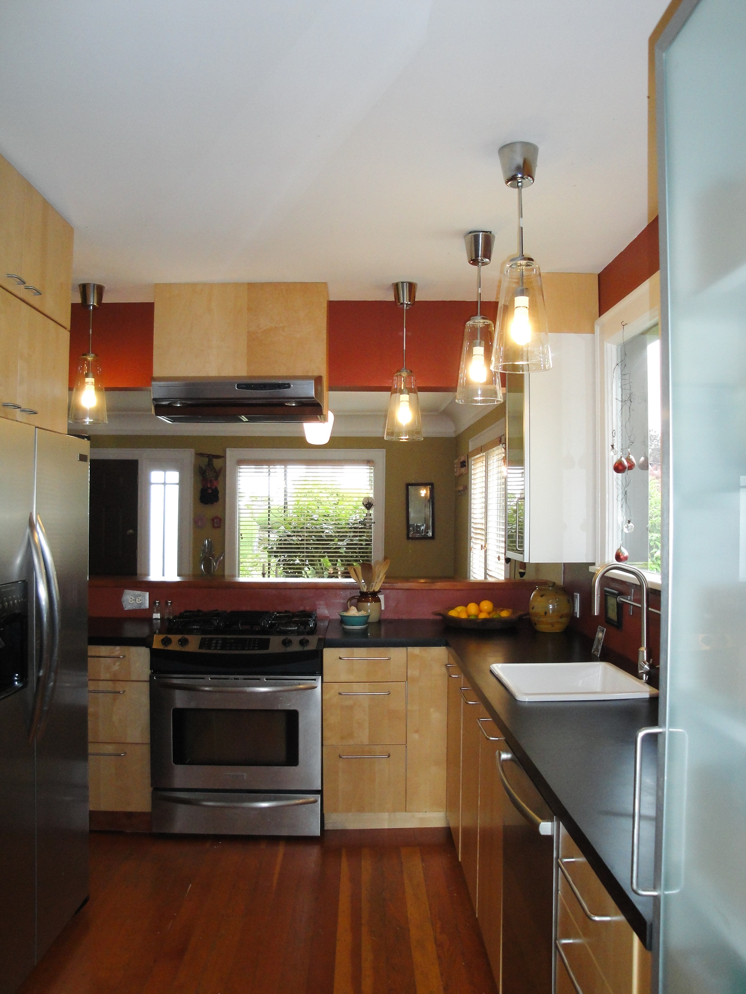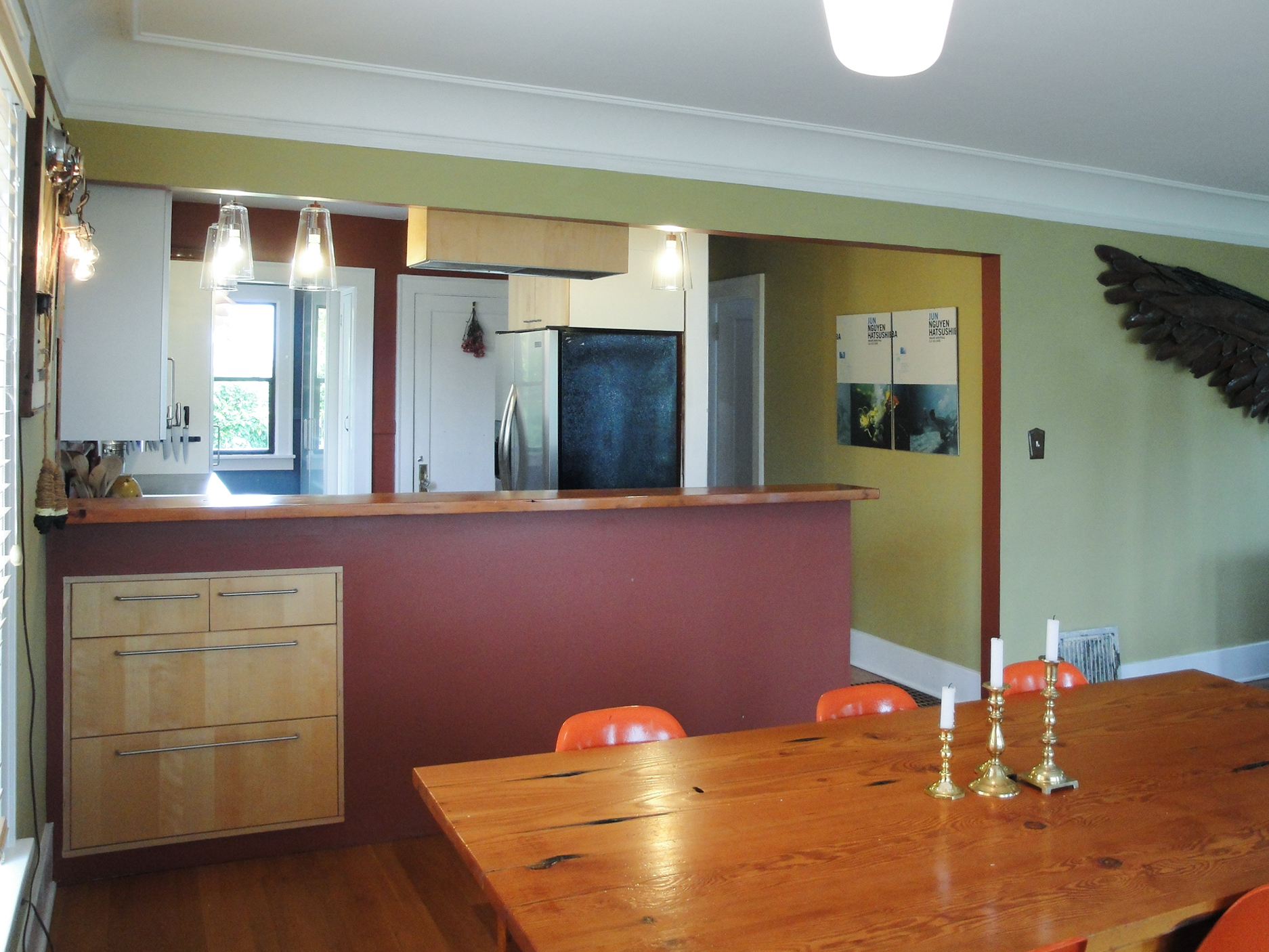 Like many homes built in the 1920s and 30s, this home had a tiny, closed off kitchen. With four doors entering into the 8 by 12 foot space the kitchen was barely functional. Hinge Studio opened the wall between the kitchen and the living room, closed off the door to the side porch and inserted a modern kitchen. The result is an open, generous kitchen that allows the cooks to work while still interacting with families and guests. The project utilizes Ikea cabinets, off the shelf, and salvaged materials keeping the costs very affordable. Old growth fir lumber taken from the walls during demolition and salvaged from an old work bench in the families garage were used to wrap cabinets and to create a farm style kitchen table. The stair leading out of the kitchen was re-clad using white washed oriented strand board, (a product typically used underneath the siding of a home) and framing grade hem-fir lumber. In order to further reduce costs the homeowners kept the decommissioned side porch turning it into a club house for their two young children.