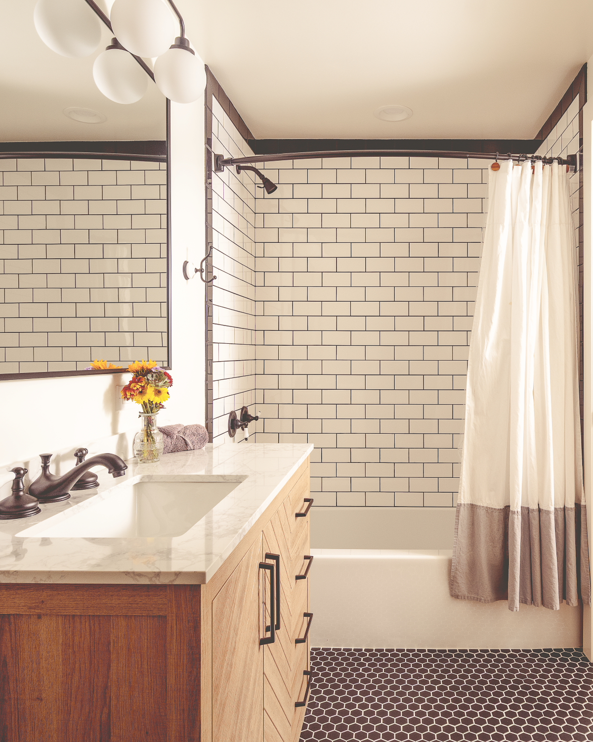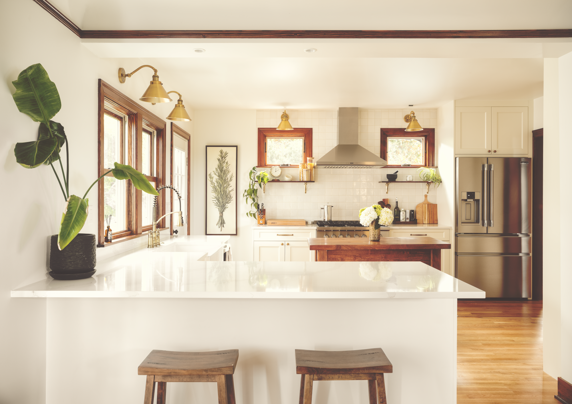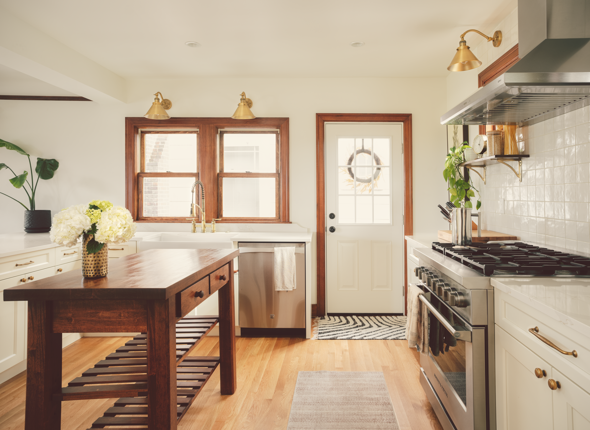 Other thoughtful touches include transforming a tiny entry closet into a built-in bench with storage and turning the former pantry into a jewel-box powder room. The result is a warm, functional home that celebrates both the view and the way the homeowners love to live.
