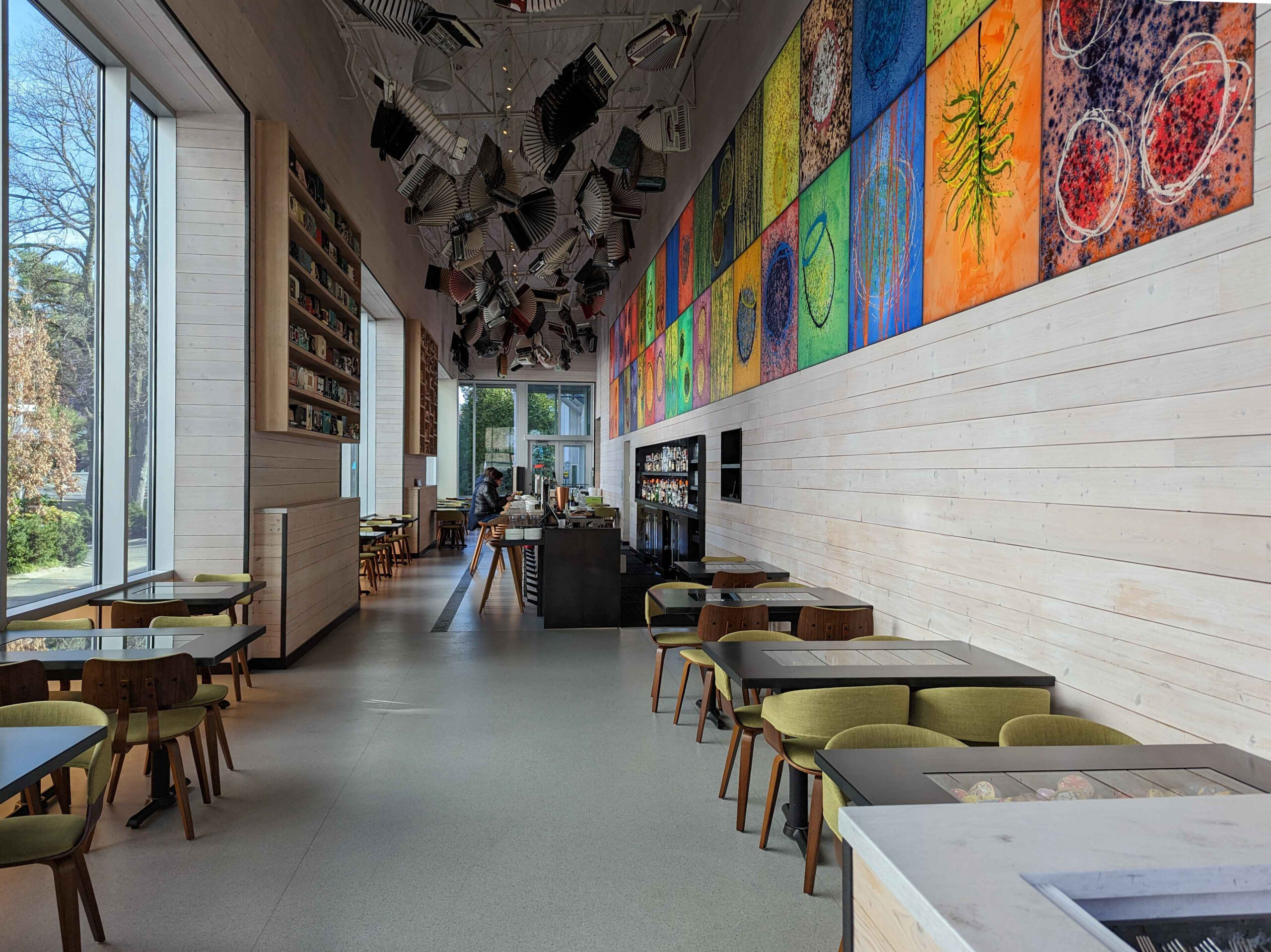 Chihuly Garden and Glass approached Hinge Studio to solve a problem. The museum’s cafe was capturing daytime visitors but felt they were missing patrons passing through Seattle Center later in the day on their way to concerts and sporting events at the the Center’s newly refurbished Climate Pledge Arena or any of the Center’s other performing arts venues. The challenge presented was to maintain the carefully curated display of Dale Chihuly’s collections and artwork, but to shift the vibe and function of the space from daytime museum cafe/diner to nighttime bar/upscale restaurant. The existing space, only 15’ wide, was divided into two intimate seating areas at either end with a long central bar. The back bar was carefully integrated into the existing lit display of Chihuly’s Drawings. Understated lighting of the bottle shelves highlights the bar function but does not distract from the dramatic illumination of the artwork and collections above. Hinge carefully centered the new bar between the existing windows to maximize its visibility in the evenings from Thomas Street – a primary pedestrian thoroughfare between evening venues and parking.