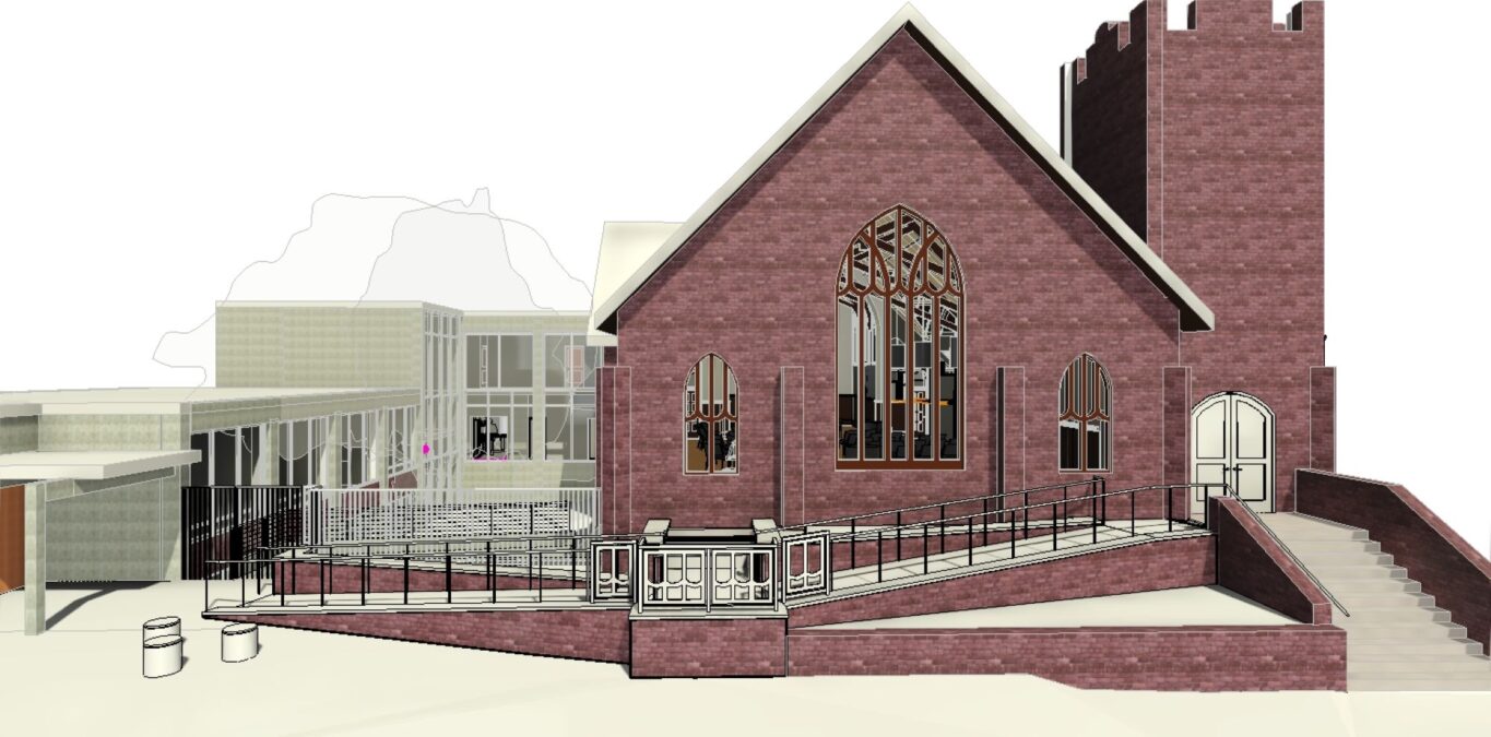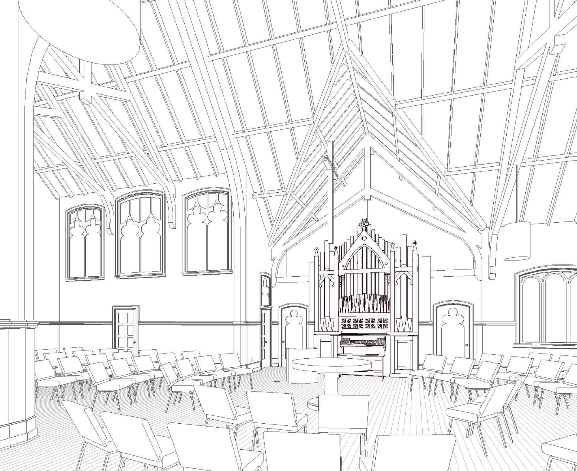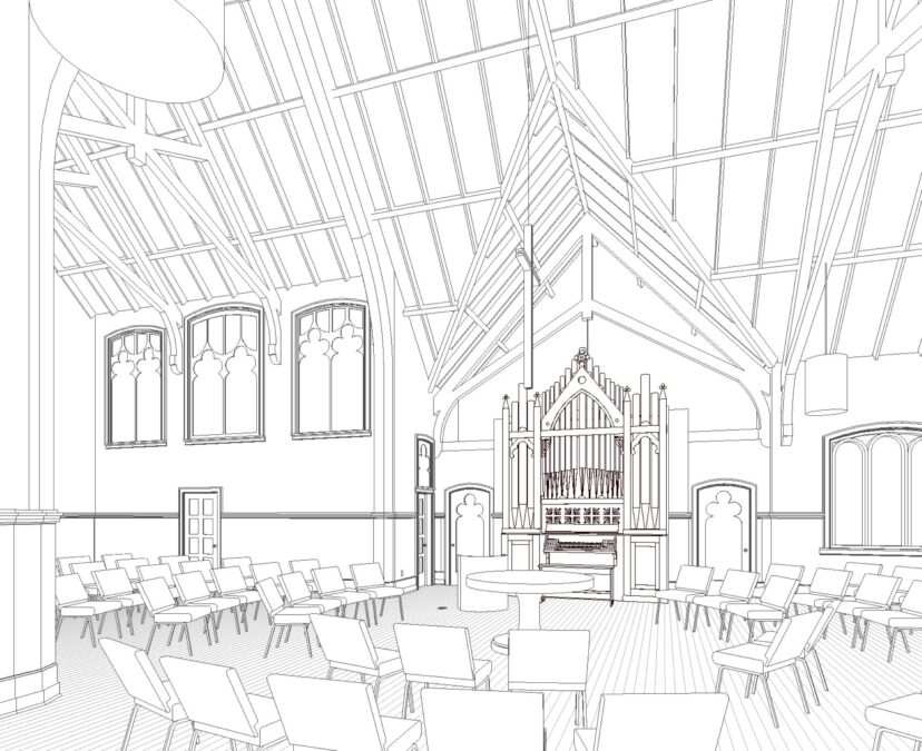 The Christ Episcopal Church in Seattle’s University District is a beautiful historic church. A 3-story school and office addition in the 1960s complicated both the ADA accessibility as well as making the main entry ambiguous. In 2019, the church vestry hired Hinge to document the existing structure and to propose solutions that would create a fully accessible building and would house a historic restored organ that they had recently purchased. The initial proposal included modifying existing stairs to house an elevator as well as an addition and entry feature to connect the 60s addition to the main church while softening the brutalist architecture of the addition. During the Covid pandemic, the church realigned their vision and has since hired Hinge to provide a revised scope that makes the church house fully accessible. The project adds an ADA ramp to the entry, an ADA restroom, and lowers the floor to make it fully accessible and flexible for other uses when not being used for worship. Hinge anticipates construction for this project in early 2025.