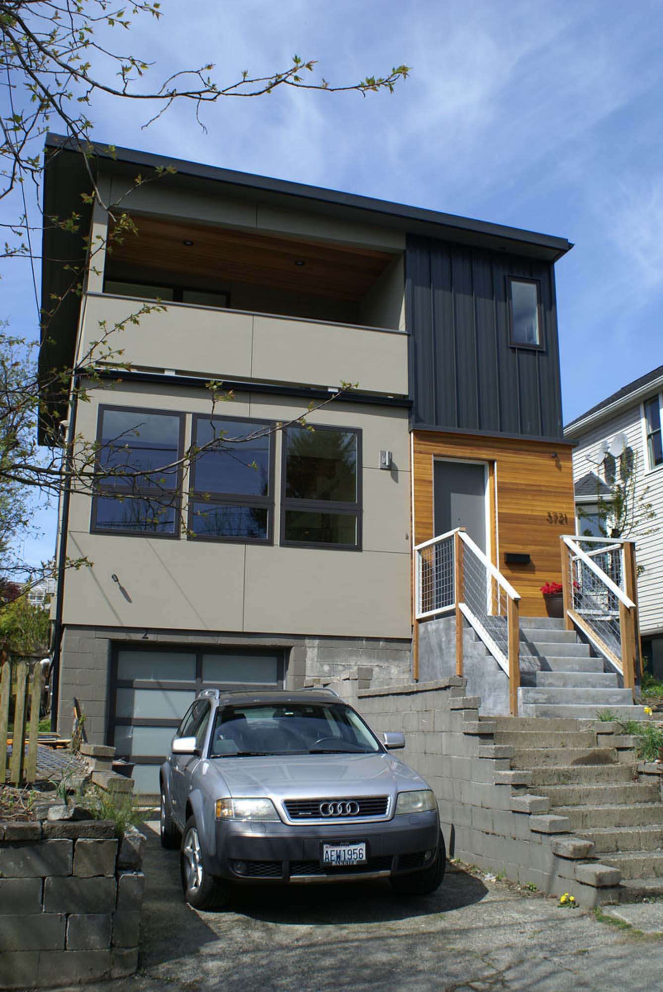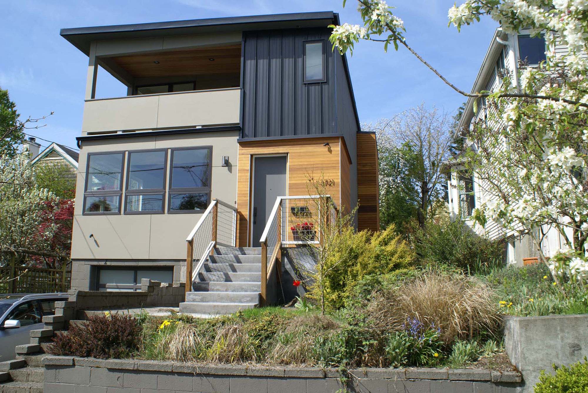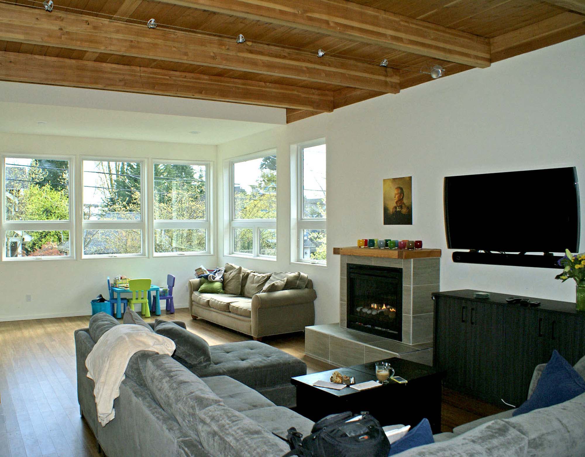 At the start of the project, the homeowners of this Wallingford area home affectionately called it the bunker. Hinge Studio worked closely with this young family to transform what was a small and dark one story concrete block structure into a handsome three story modern with views of the lake. An open floor plan, high ceilings, exposed structure and an abundance of natural light were paired with economical building materials to create a spacious 4 bedroom home on a modest budget. By reusing existing foundation, an efficient linear floor plan was developed that allows this home to feel much larger than its 2600sf. The home utilizes daylighting, passive ventilation, and hydronic heating to reduce its impact on the environment.