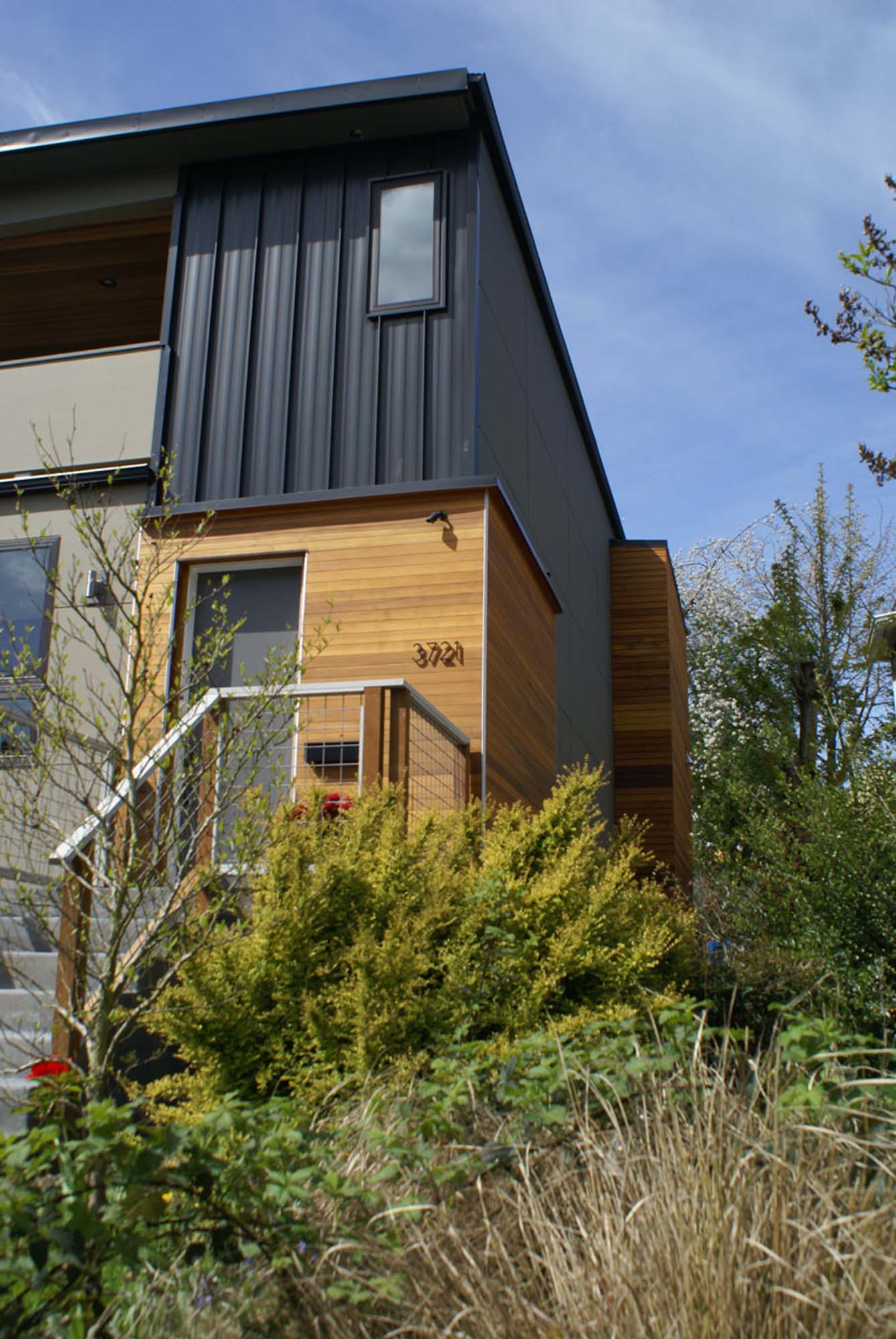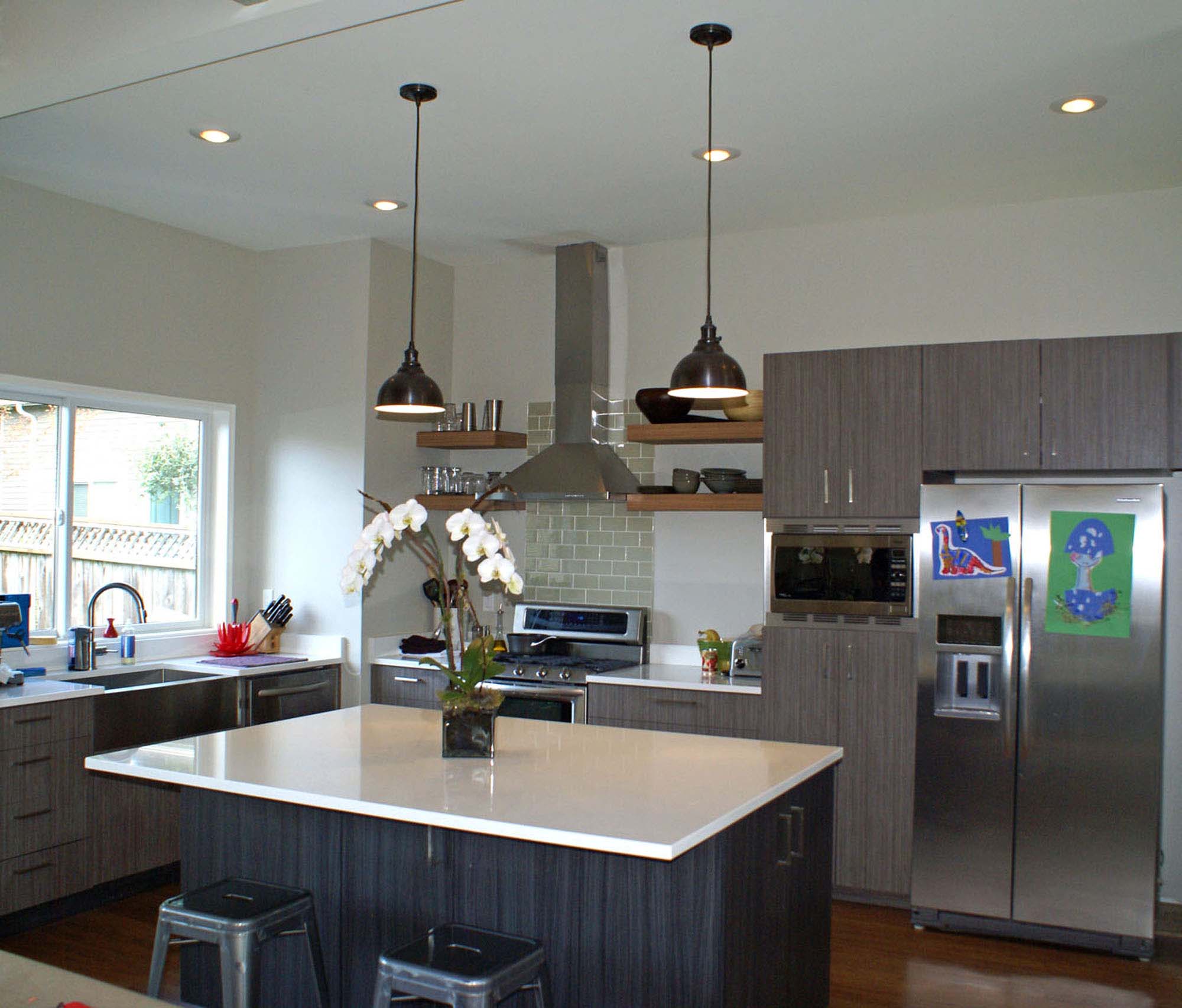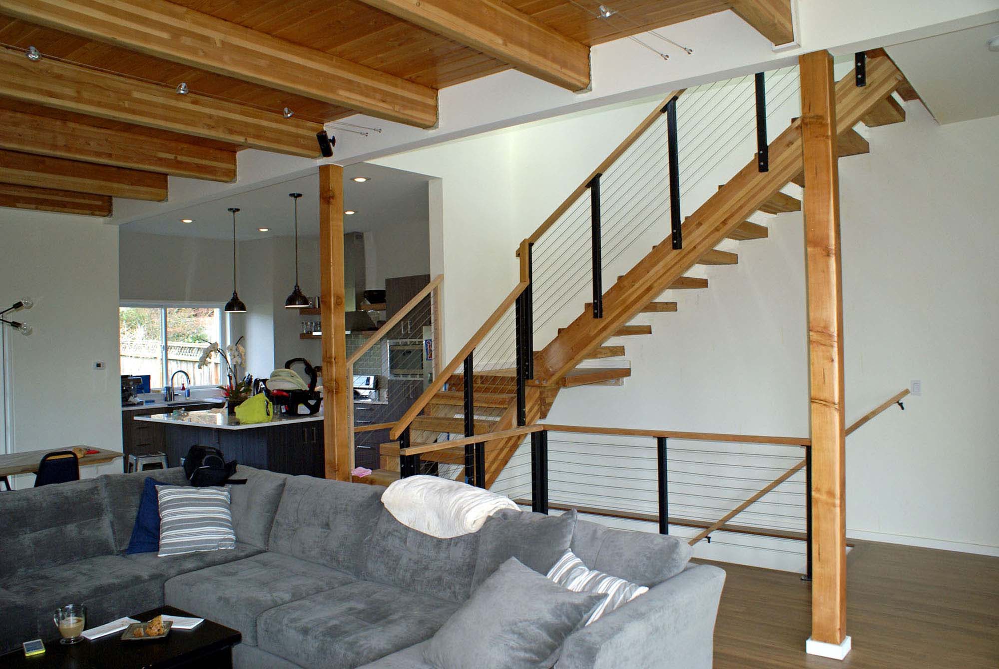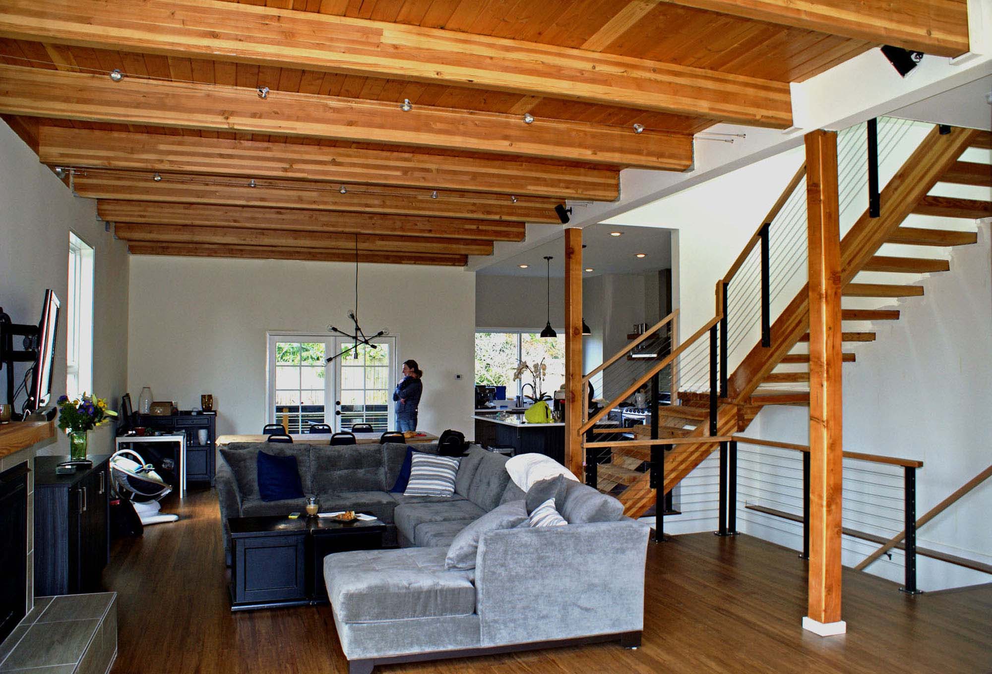 At the start of the project, the homeowners of this Wallingford area home affectionately called it the bunker. Hinge Studio worked closely with this young family to transform what was a small and dark one story concrete block structure into a handsome three story modern with views of the lake. An open floor plan, high ceilings, exposed structure and an abundance of natural light were paired with economical building materials to create a spacious 4 bedroom home on a modest budget. By reusing existing foundation, an efficient linear floor plan was developed that allows this home to feel much larger than its 2600sf. The home utilizes daylighting, passive ventilation, and hydronic heating to reduce its impact on the environment.