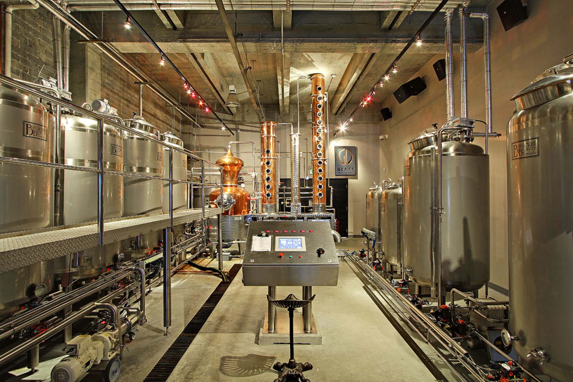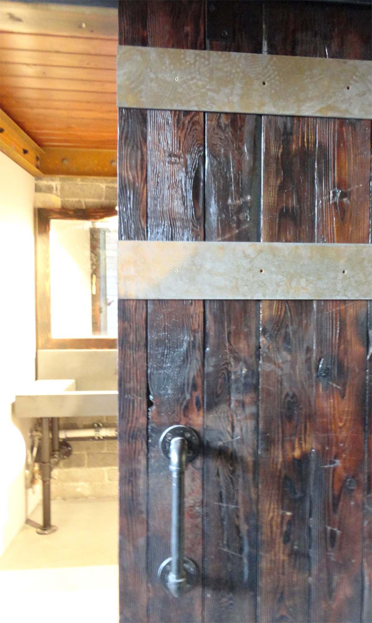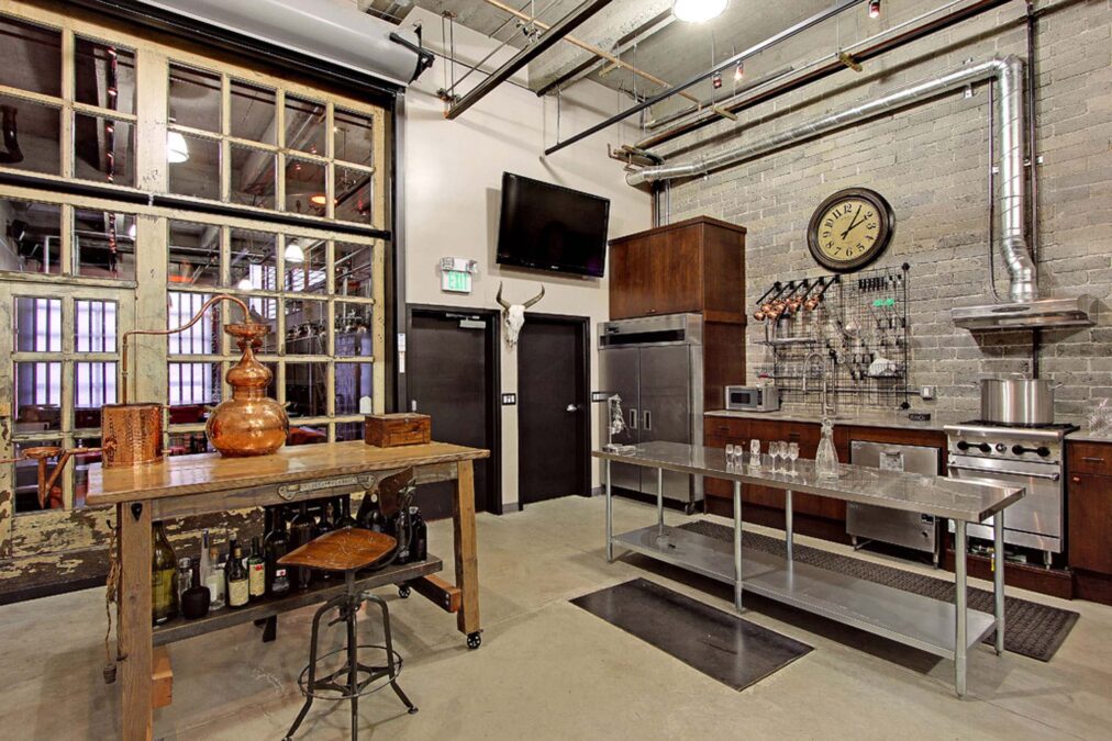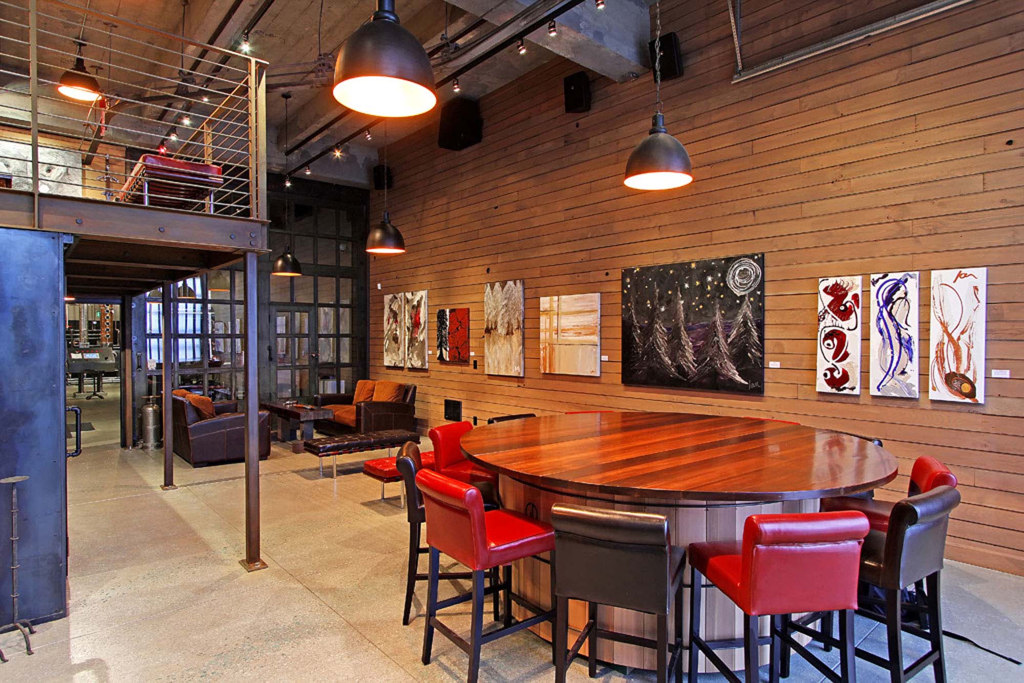 Hinge Studio collaborated closely with the owner of this new craft distillery to create a space that marries industry with art. The project capitalizes on the raw beauty of the 1920’s concrete-framed building in the SODO neighborhood of Seattle. By introducing steel and reclaimed elements found during demolition, the tasting room is embodied with a welcoming warmth. Full-height reclaimed wood walls serve as a canvas for the owner’s art collection. A beautifully patinaed wood and glass door salvaged from the original truck entrance of the building creates a full wall of glass, giving visitors a view of the impressive copper and stainless steel still in the distillation room. A steel and wood mezzanine was inserted into the tasting room space to house required restrooms and to provide the owner with an office space. An artful steel ships ladder provides access to the office and offers opportunities for display of product.