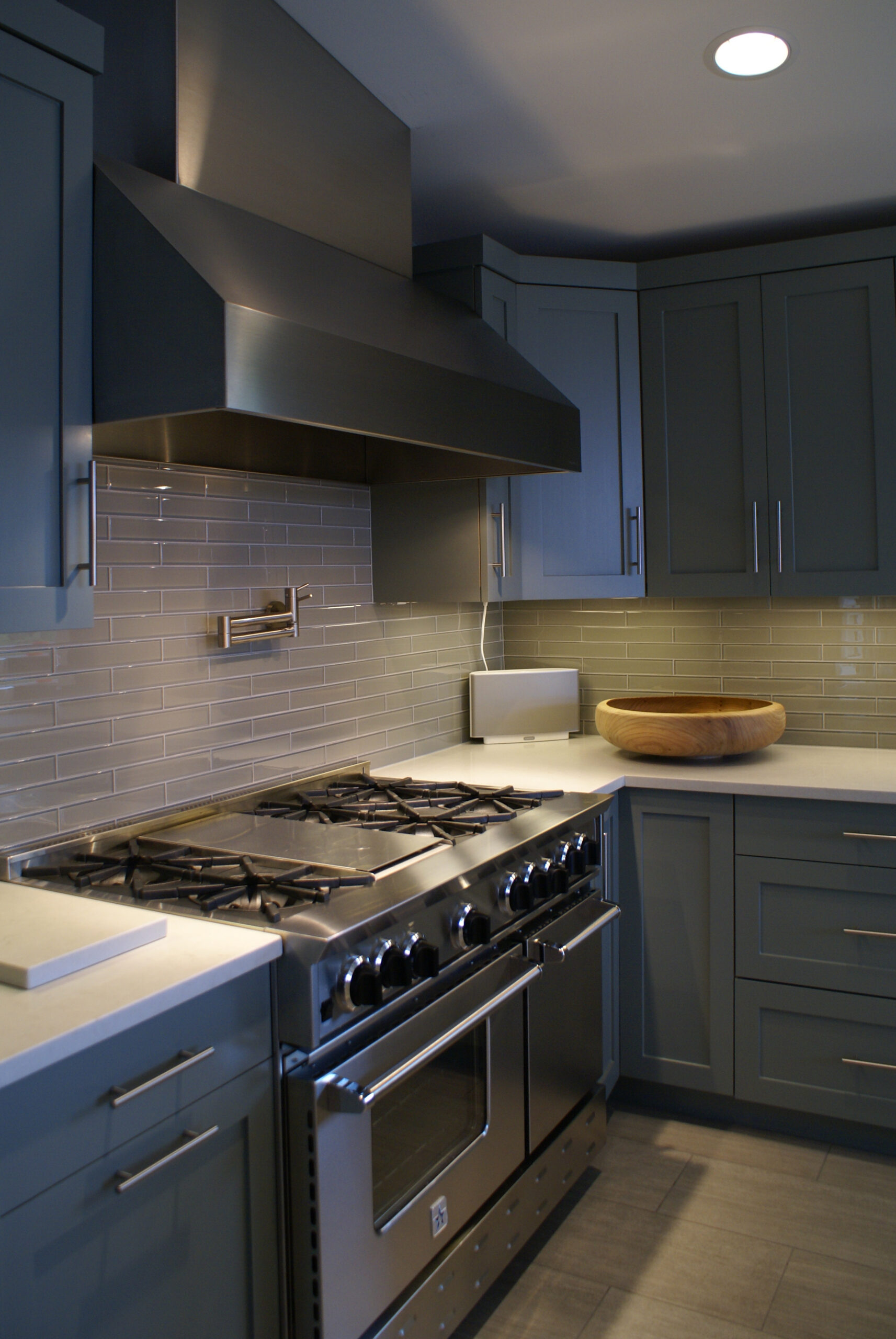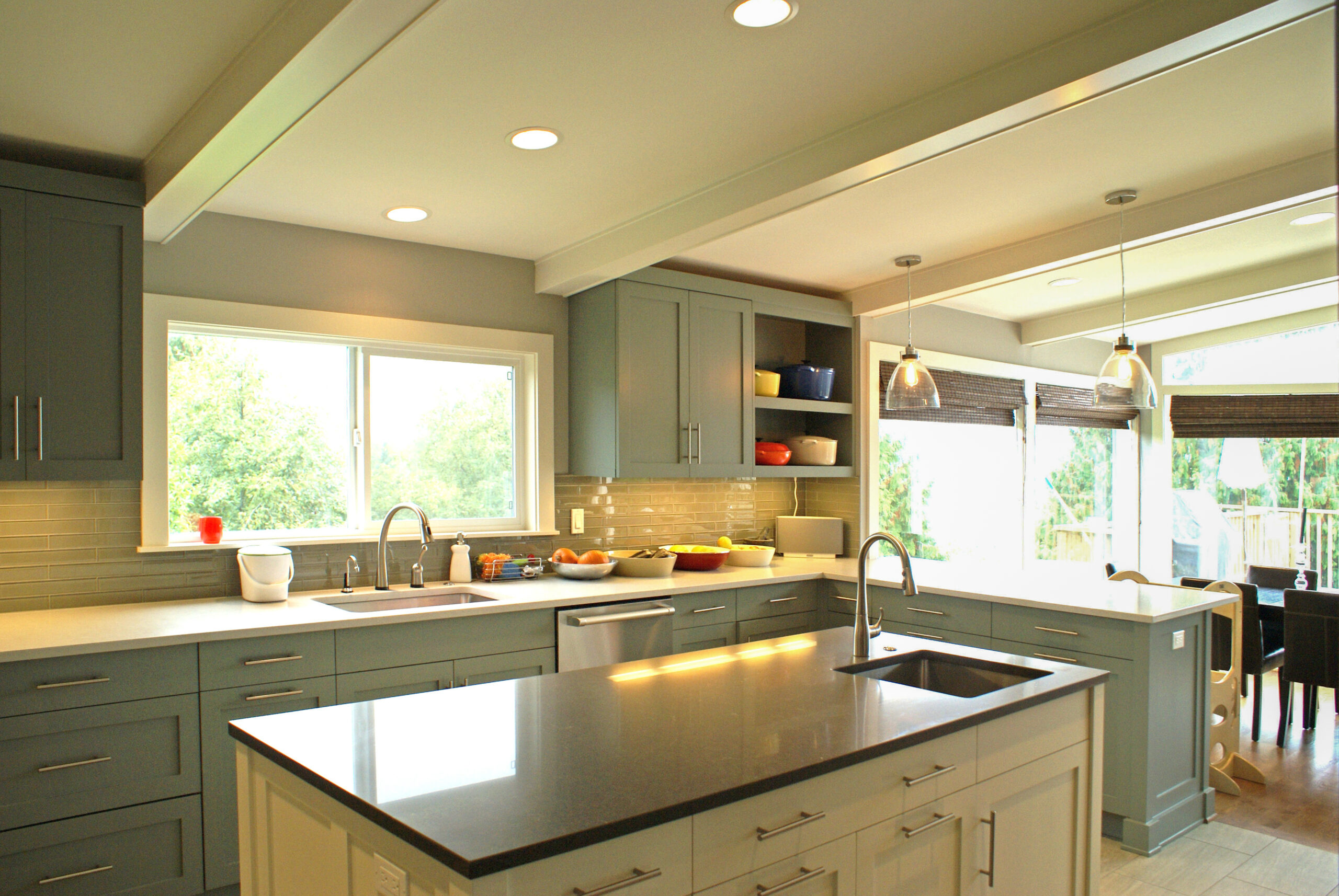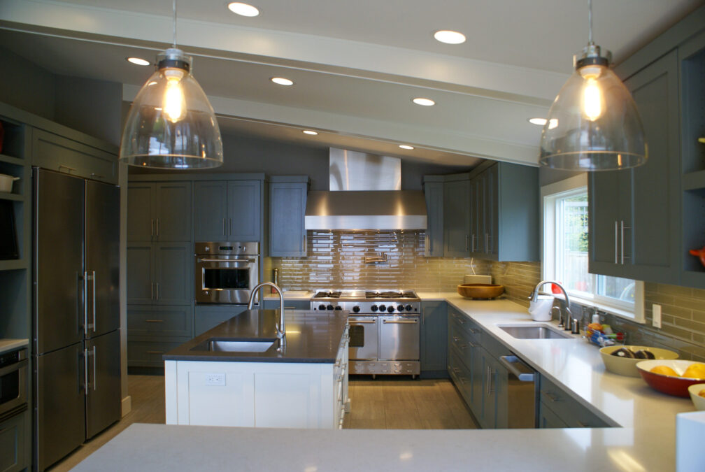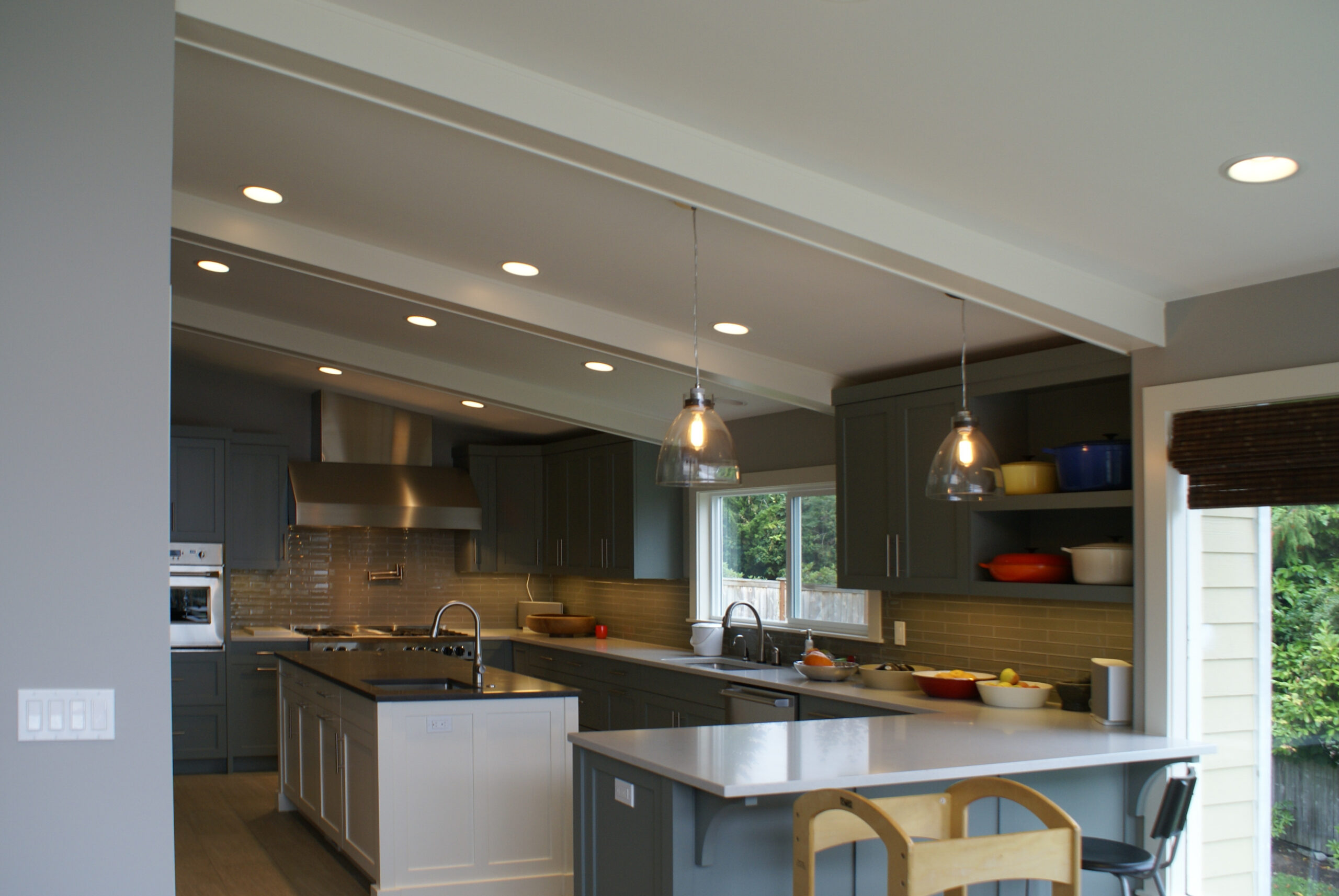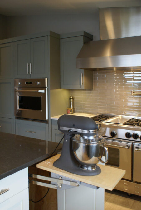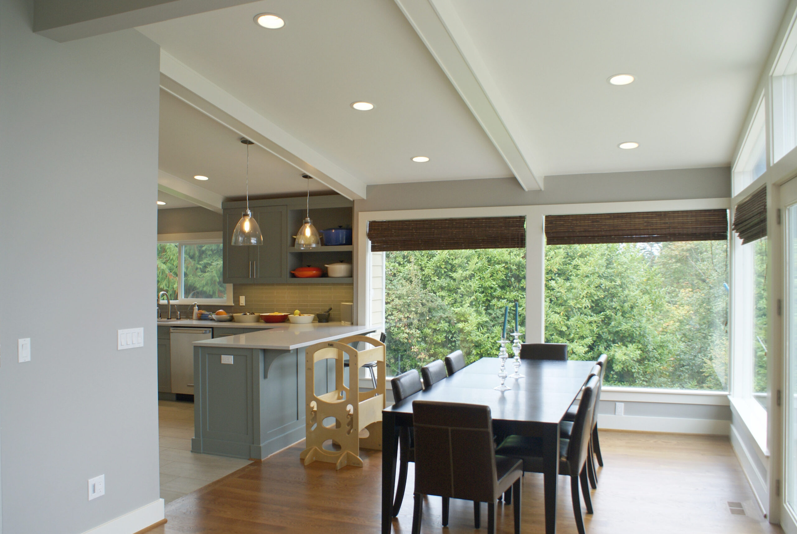 Small moves made a big difference in this kitchen and living room renovation. By removing a portion of a very large central chimney, Hinge Studio was able to create a visual connection between the kitchen dining room and living room in this mid-century home. A small counter depth bump out in the kitchen allowed for the addition of large working island. The kitchen was dramatically updated from it’s original postwar condition into a true chef’s kitchen worthy of this restaurant professional’s expertise. By updating the floors and ceilings with lighter brighter finishes, the project took advantage of the light and views of this lovely mid-century home.