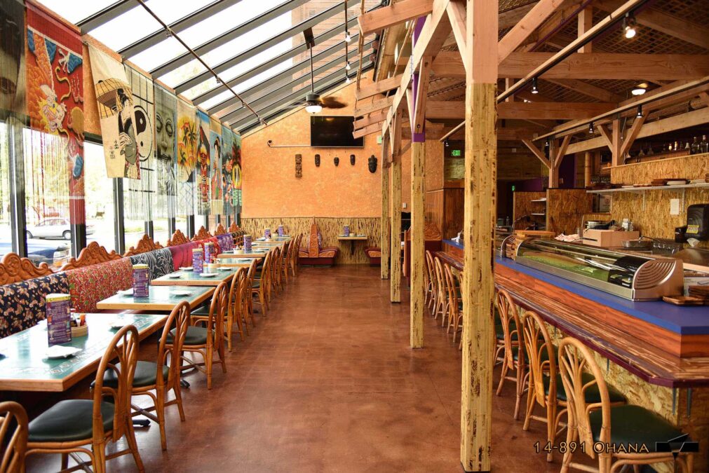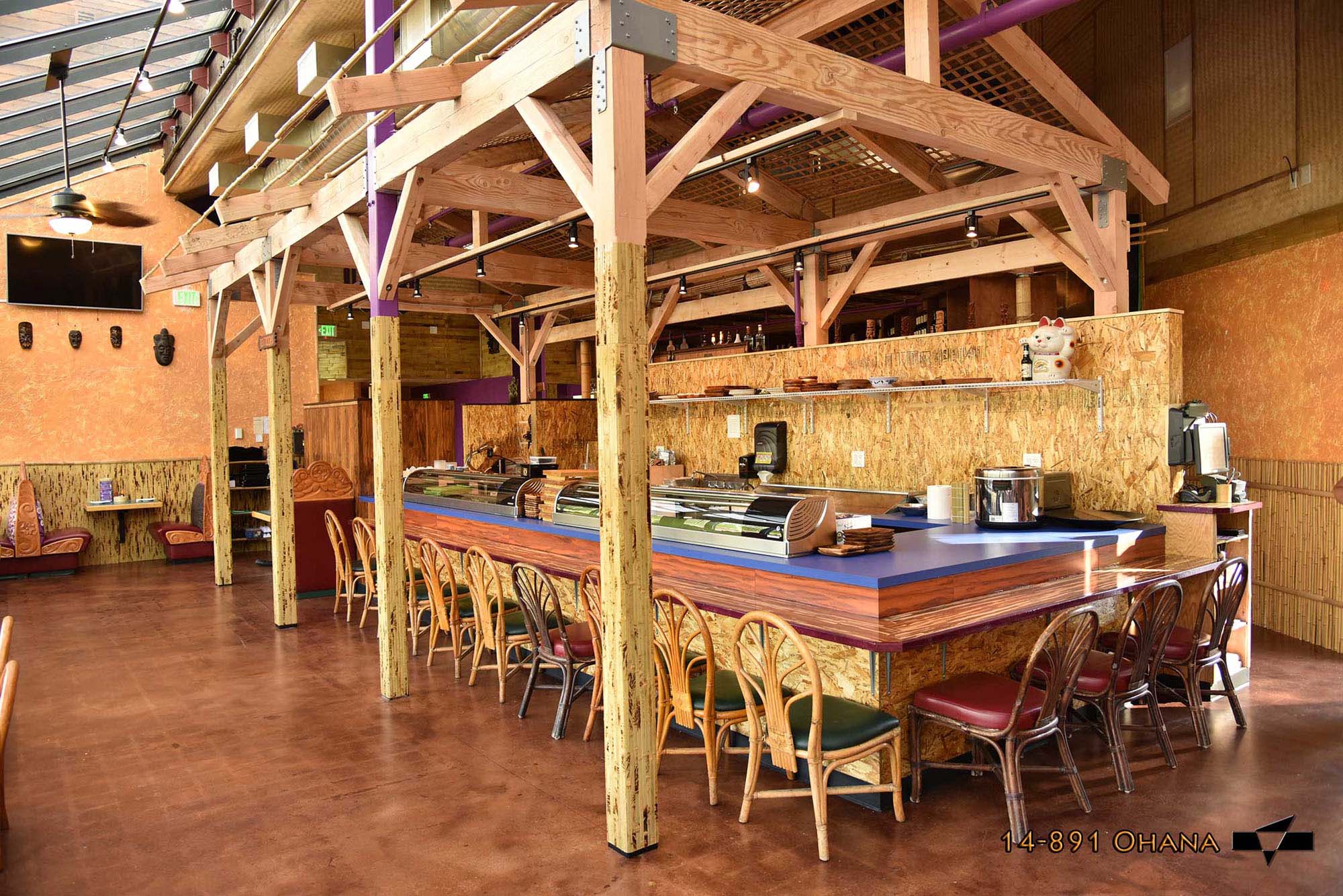 Ohana Eastside, a Hawaiian and sushi restaurant in Issaquah, is an eclectic combination of tiki bar meets raw materiality. 90% repurposed with salvaged or reused furniture and interior finishes, major adjustments to the space include the removal of several partitions and the existing dropped ceiling, revealing a lofty 20’ high space that perfectly fits the lively atmosphere below.