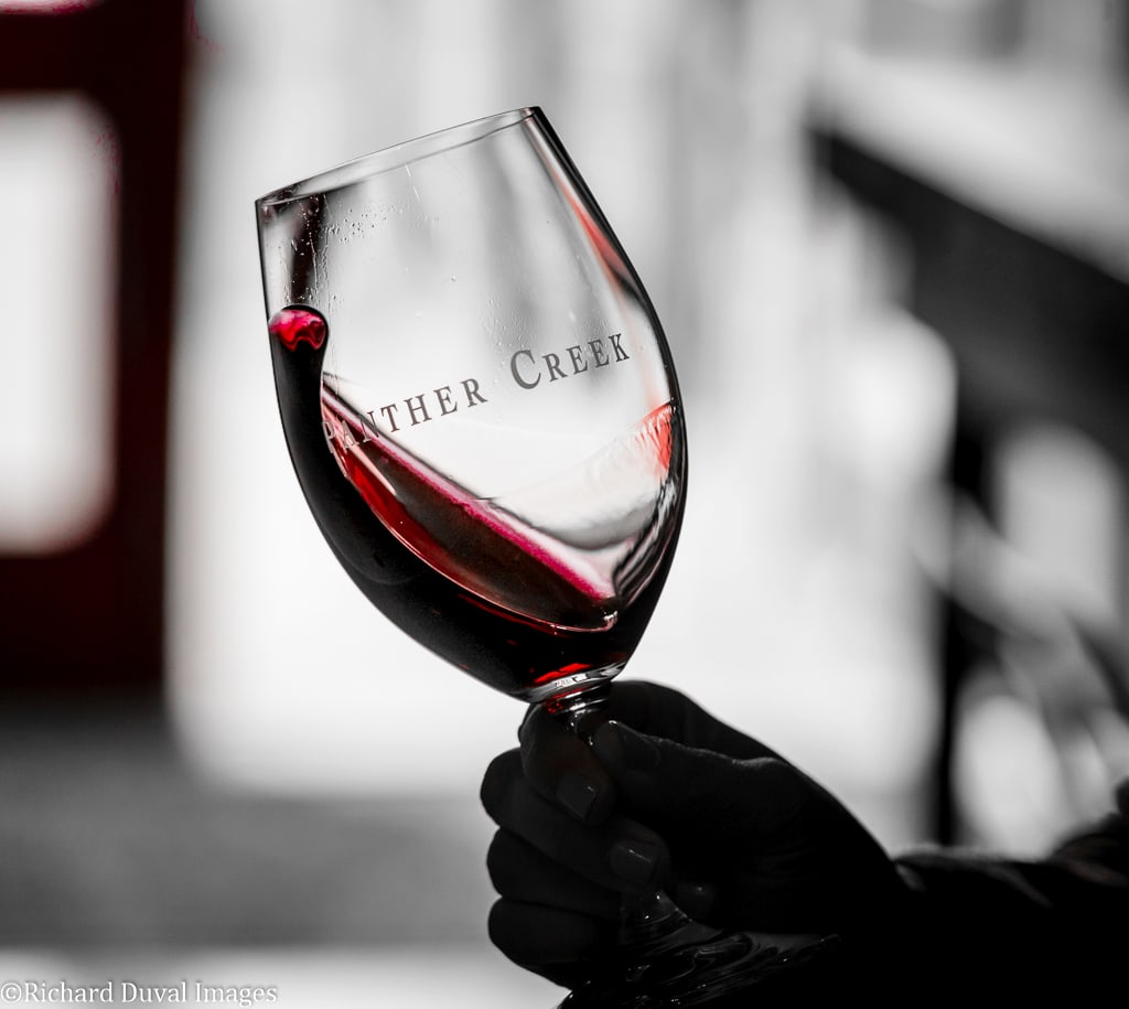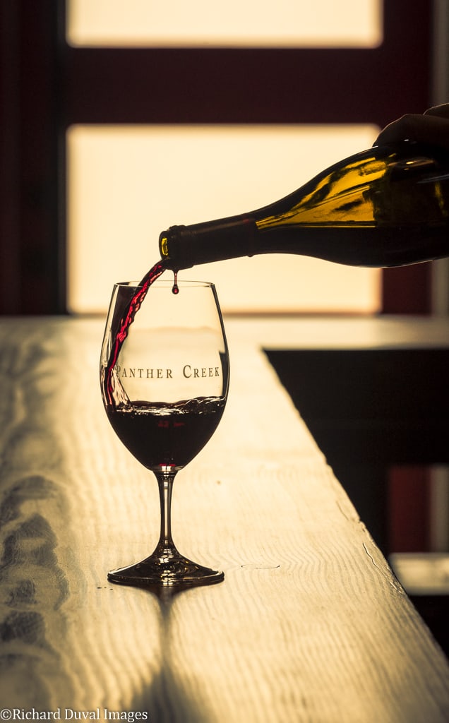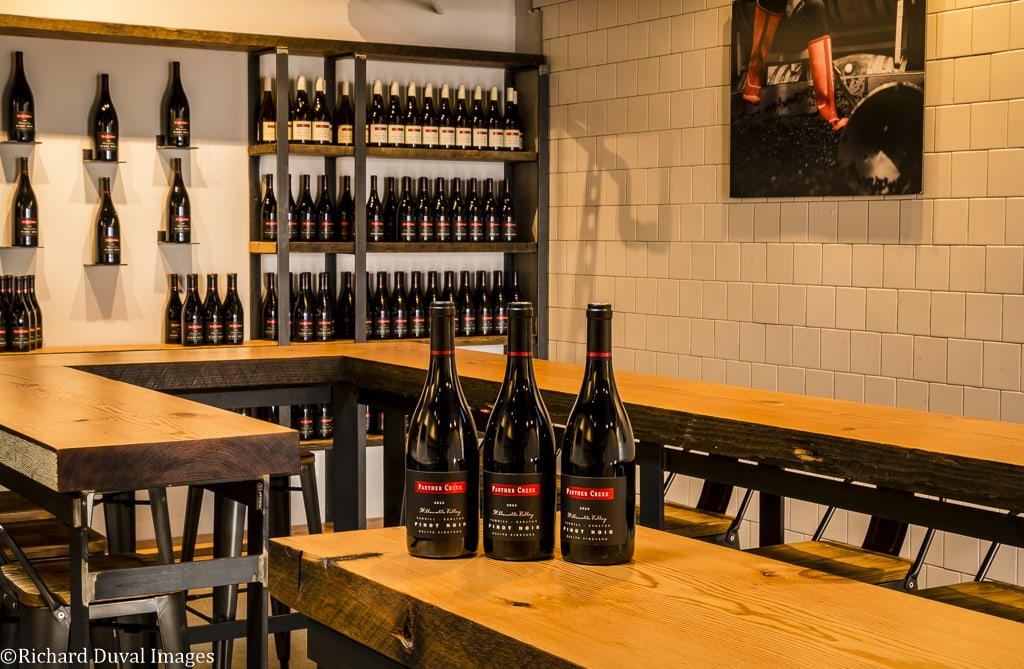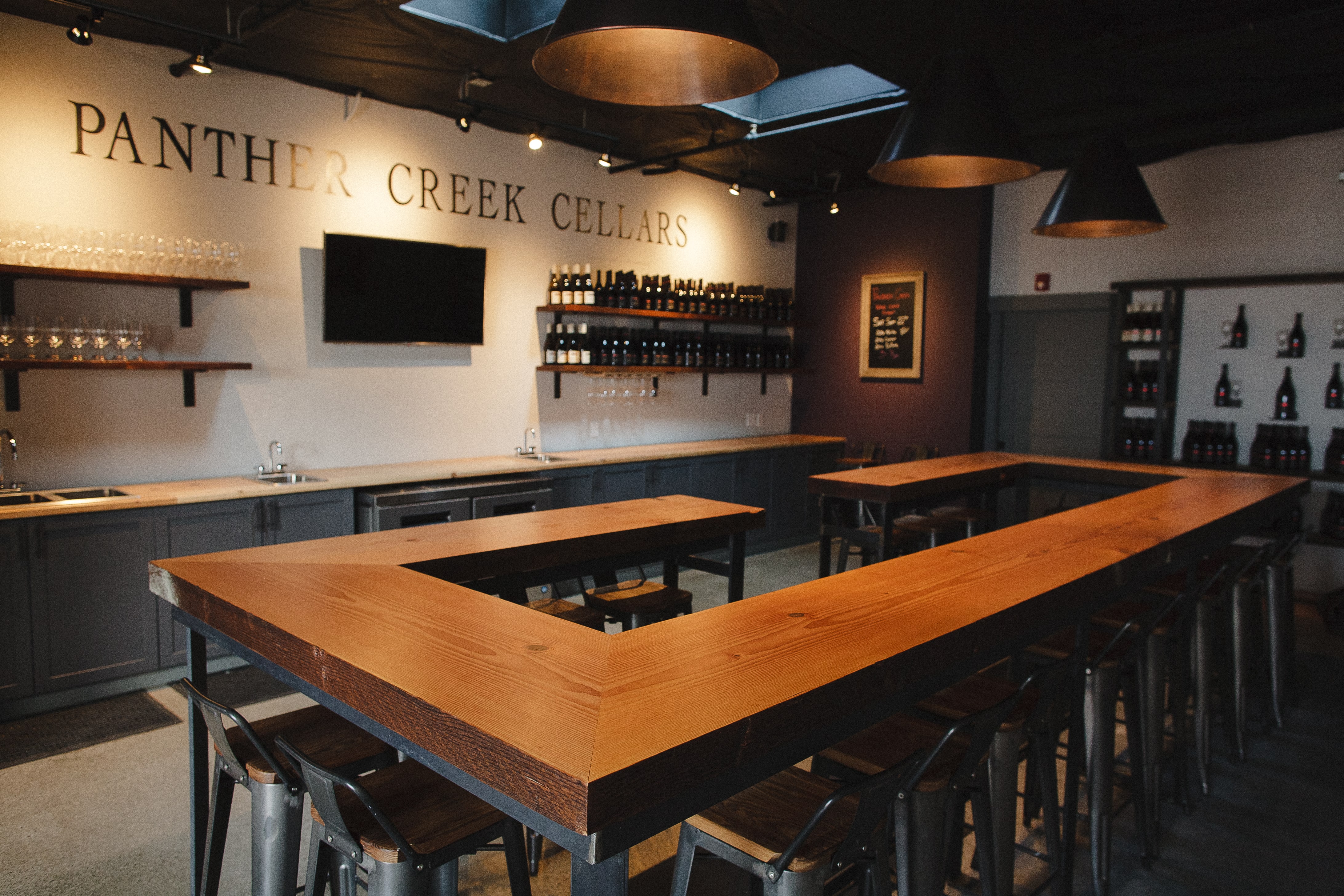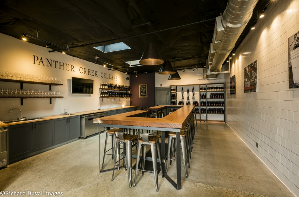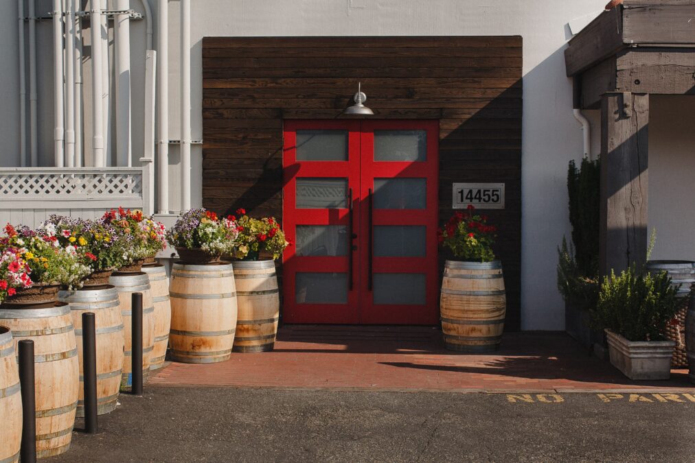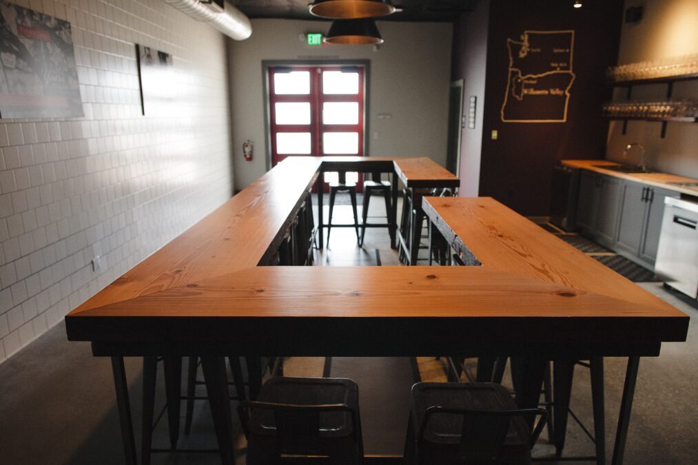 Housed in a formal commercial bakery, this tasting room utilizes every square inch of its 835 sf. A u-shaped wood and steel tasting table anchors the center of the long narrow space – creating a dynamic communal setting to sample wine. Unlike many tasting rooms, the prep and washing area is situated in the main tasting room. Concealed in simple shaker style cabinets, the proximity to the tasting table not only saves space but creates a very functional efficient work environment for servers. Hinge utilized the existing subway tile and industrial concrete floor to both save cost and build upon the buildings existing character. A fairly drab industrial facade was dressed up with a Shou Sugi Ban Japanese charred wood siding. The tasting room uses the over sized red doors as a former of signage and branding.
