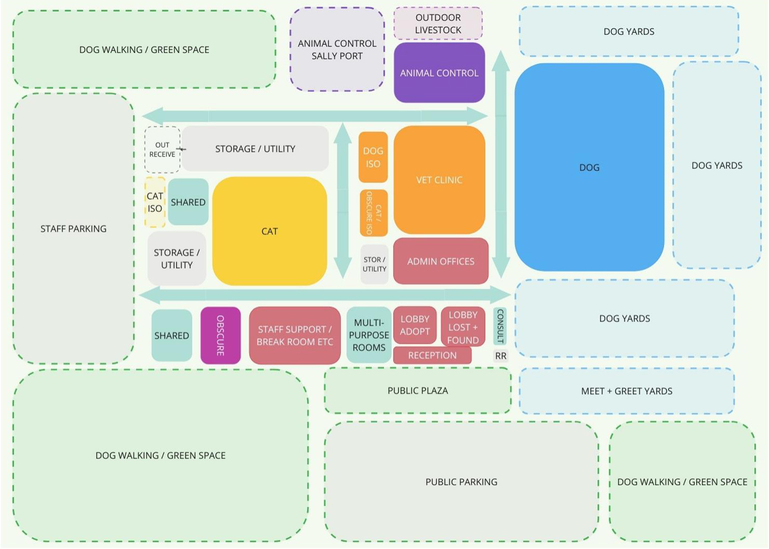 Hinge Studio served as prime consultant and architect in evaluating the needs of Regional Animal Services of King County (RASKC) and reviewing their existing facility to determine if it could support their current and future needs. Hinge coordinated a team including, Structural, Civil, Geotech, Environmental, and MEPF engineers as well as a cost consultant. Through tours and visual inspection of the site and building, review of existing documents and code research, followed by staff and volunteer interviews/surveys, the team identified the existing space allocations, operational issues of the facility and the current lifespan of the building and site. Hinge also collected historical data and reviewed shelter best practices to project current and future needs for the facility. The team developed programs and associated costs for possible short term reuse of the existing facility and as well as for a new facility, site unknown.