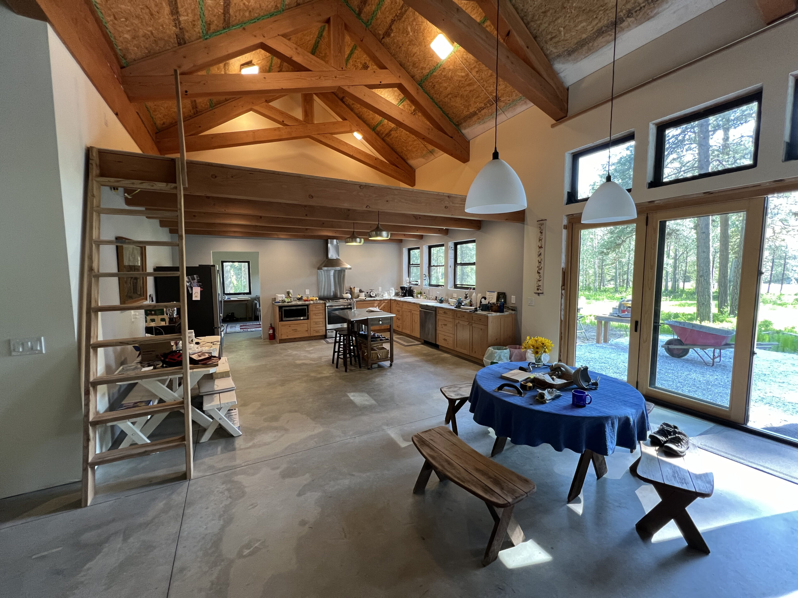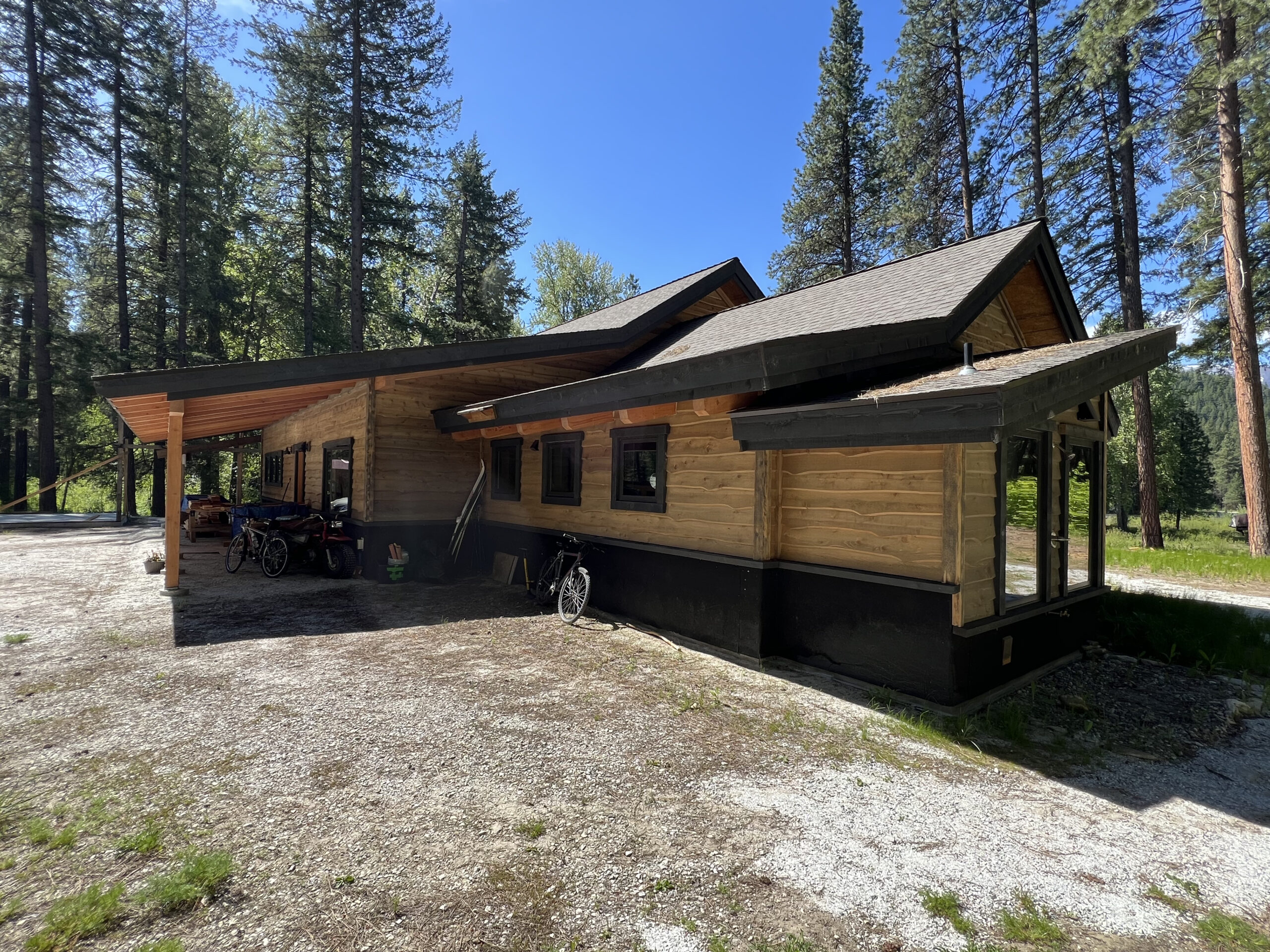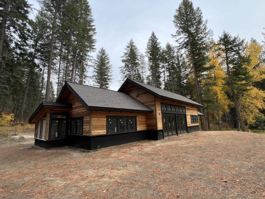 This sweet timber frame cabin sits at the end of River Road in Plain, Washington. The orientation and layout of the structure was carefully studied to optimize this incredible site with it’s views to the Wenatchee River and Big Jim Mountain beyond. The owner’s, life long environmental scientists, worked closely with Hinge to select materials and systems to reduce energy consumption and the impact on the environment. The building employs thick super insulated walls, and a Structurally Insulated Panel roof made from plant based foam insulation. Timber frame trusses and beams make up the structure. The owners worked with a forester to sustainably harvest wood from the site. The wood was then milled locally and stored on site to be used for interior and exterior mill work including kitchen cabinets. Live edge wood siding and hand selected river rock from the site are employed for the exterior cladding. This materiality combined with the modest scale of the building form which steps down from higher to lower roof forms creates a structure that sits in harmony with this lovely site. Window placement was carefully studied from both the interior and the exterior to maintain a balanced harmonious form while optimizing views and daylight. The main bathroom features a cedar soaking tub. A french style awning window with no center mullion was employed to create a feeling of sitting in the forest while bathing. This 2300 sf home houses 2 spacious main suites, an additional bedroom, ample laundry and entry to handle the snowy gear in this winter retreat, and a large sleeping loft. Hinge took great care with the scale and flow of the home so that it feels appropriately sized whether two people or 10 people are utilizing it.