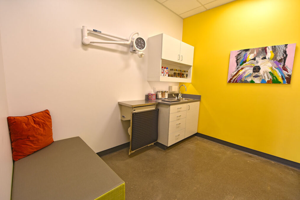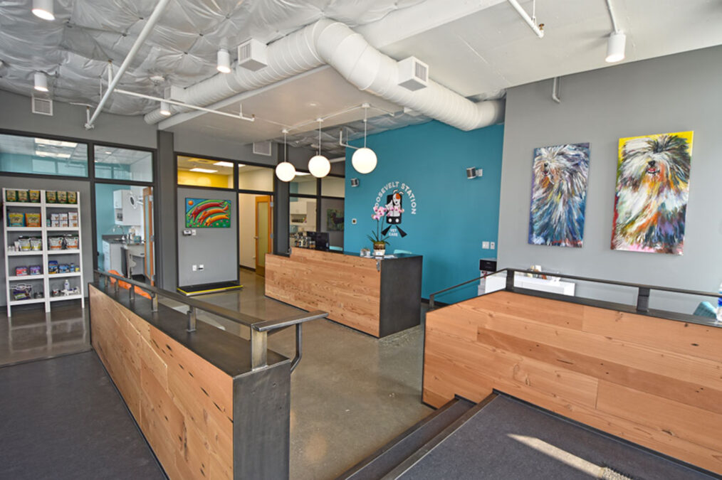Bright and fun, this animal hospital reflects both the aesthetic and energy of the growing Roosevelt neighborhood and of the hospital’s pair of lively doctors. The square footprint of the 1900 sf clinic has two full sides of storefront glass creating wonderful light, but offering a programmatic challenge to a space that requires small private spaces. Hinge collaborated with the two doctors to find a room layout that optimizes what the building offered with what the clinic needed. The reclaimed wood and steel reception desk and entry ramp tie back to the northwest roots of this family-oriented practice. Bright colors, wood doors and generous use of translucent glass panels create a warm cheerful atmosphere. In the treatment area, custom casework is designed to utilize every square inch of space and is made with colors and materials that emphasize the animal’s comfort along with the cleanliness necessary in a medical facility. The result is a highly functional work environment to take care of the young neighborhood’s well loved family pets.