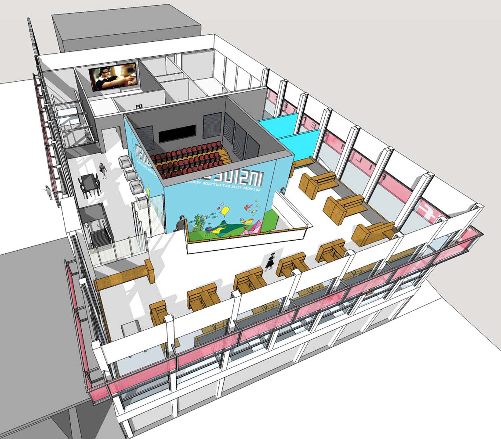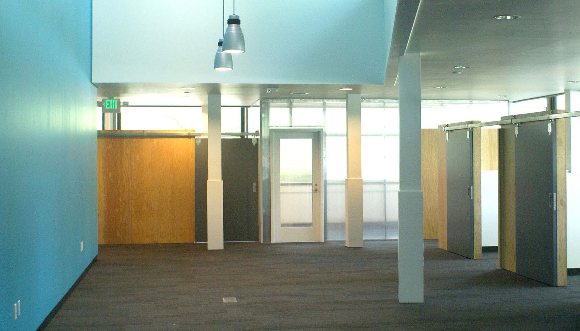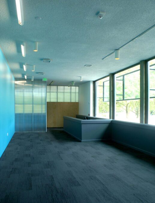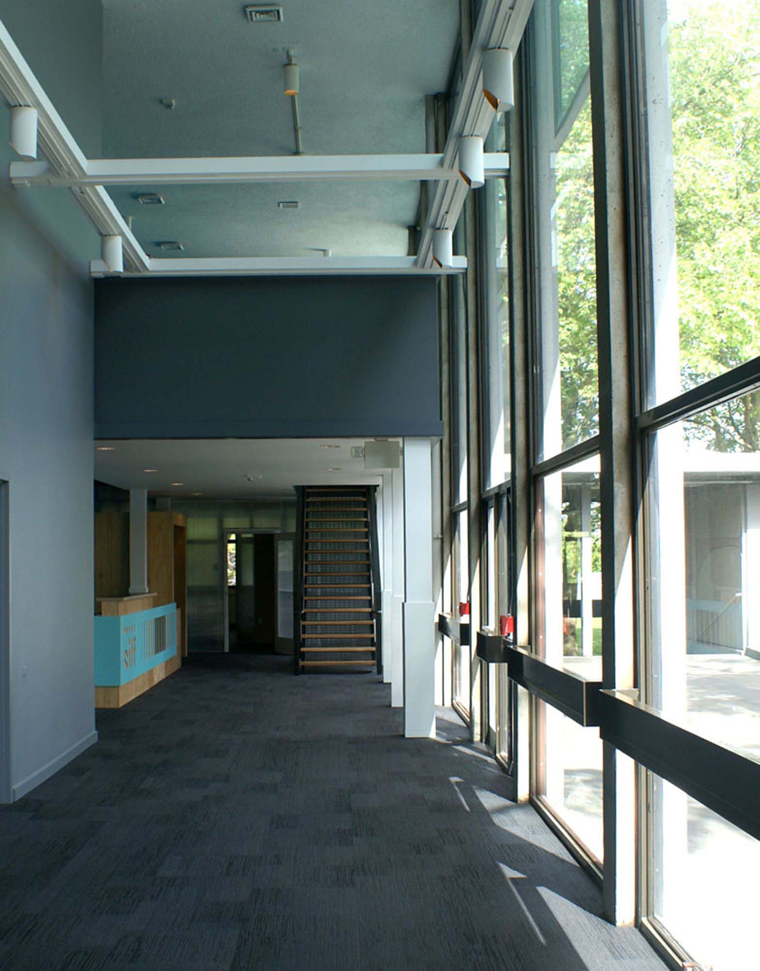 Seattle International Film Festival’s new home and year-round venue is housed in one of Paul Thiry’s original buildings from the 1962 World’s Fair at Seattle Center. The challenge of this project was to insert a 100 seat theater, classroom, archives, and offices into the existing building without loosing the glassy airy quality of the mid-century modern structure. The design pulls the theater to the center of the structure keeping the perimeter as open as possible. Where enclosed office were required, over-sized sliding doors and translucent plastic walls allow as much light as possible to enter the center of the space. The project utilized a simple material palette of plywood, polycarbonate, color and light to create a simple, fresh space that reflects the character of the organization without stretching the budget. The original 1962 stair was uncovered from beneath drywall and trim and returned to it’s former glory. The 110 seat theater has a state of the art digital and analog projection booth and reclaimed seats from the Cinerama. The 10,000 sf public/private project was fast-tracked and completed in 5 months, on-time and on-budget. Kate Cudney, Hinge Studio Founder, was the project architect while at Owen Richards Architects.