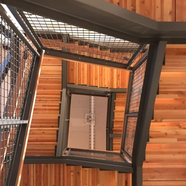 There is a special kind of stair that we use in minimally occupied spaces like lofts or storage spaces. It is called an alternating tread device. Designed to be easier to climb than ladders, these steep stairs can be made to be very sculptural like this one at Glass Vodka that doubles as a display shelf for bottles at the Distillery entry.